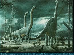 This time I am going to talk about Brachiosaurus. Brachiosaurus was a sauropod, or long-necked dinosaur. He was as tall as a four story building and each of his neck bones was three feet long. Brachiosaurus had a bulge on the top of his head. A person is only about up to Brachiosaurus' ankle. He weighed 80 tons. If he bent his knees too much, Brachiosaurus would tip over.